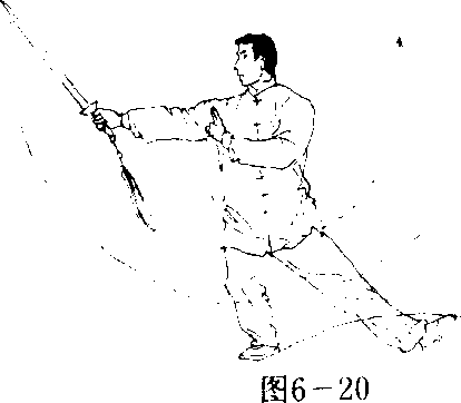 (1) 上步落剑 身体略向右转,左脚向左上步,脚跟着弛;同 时右手握剑向上、向右划弧至身体右上方,腕稍低于肩,臂微屈,剑 尖朝右上方;左手剑指屈肘落于右肩前,手心斜朝下;目视剑尖方 向。(图 6—20)