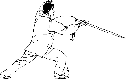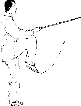 【意 气】意想松右胯,提右膝,劲蓄于右膝,手与脚相吸一 同伸出,劲由剑柄向剑尖贯注,呼气°