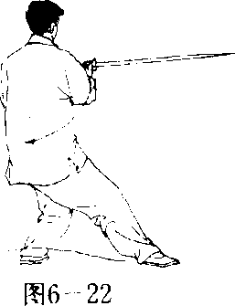 (1) 转身抽带 左腿屈膝半蹲,重心后移,身体略向左转;同 时右手握剑随转体向左平带,手心朝上,腕同胸高,剑尖朝前;左手 剑指屈肘下落附于右腕部,手心朝下;目视剑尖方向。(图6-22)