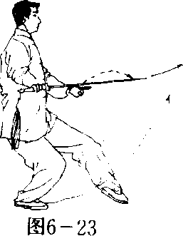 (2) 虚步分剑 身体略向右转,右脚向后撤步,随重心后移 成左虚步;同时右手握剑随转体手心转向下,使剑经体前向右平带 至右胯旁,剑尖朝前;左手剑指向下、向左划弧至左胯旁,手心朝 下;目视剑尖方向。(图6—23)