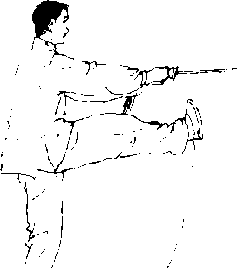 左腿直立,右脚以脚跟为力点,勾脚向前蹬出;同时两手捧剑 略回引再向前平刺;目视剑尖方向。(图6—25)