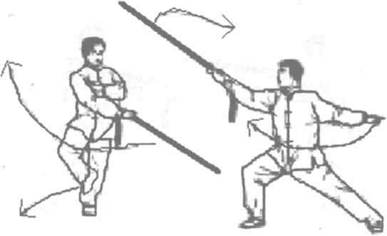 持剑手以立剑或斜立剑,使剑刃斜向上或斜向 下,由左向右或由右向左着力,力达剑身前部为截。 截剑须挥剑横断,阻截破坏对方进攻,力点在剑刃前 部。根据截剑方向,可分为上截、下截、左截、右 截、后截等。截剑多用满把与螺把(图5-2-16)。