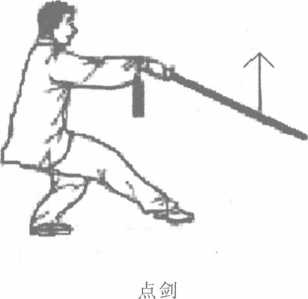 持剑手提腕,立剑,用剑尖向下啄出为点。点剑 前要充分利用反向力,体现出欲上先下、欲下先上的