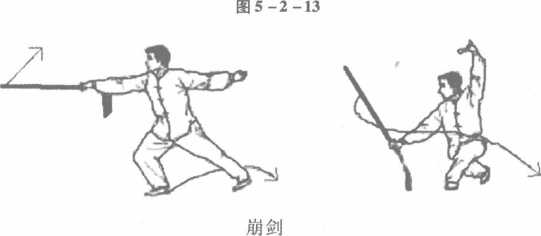 崩剑须沉腕发力,虎口向上,剑尖快速向上勾 挑。持剑手屈腕上翘,立剑,剑尖由下而上,力达剑 上刃前端。传统剑术中称垂锋下击为点,挑锋上击为 崩。崩剑与点剑正好运动方向相反。崩剑多用满把 (图 5-2-14)o