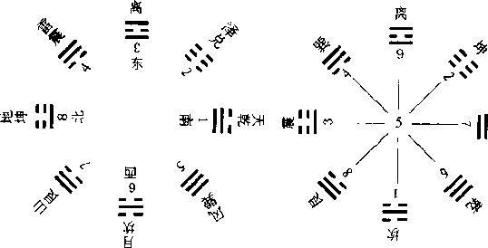 八卦的数字很有趣,一、二、三、四向左旋转,五、 六、七、八向右旋转,这就是《易经》的基本原理:“天 道左旋,地道右旋。”而且每个数字和对面的数字相 加,均为九,故曰“九在其中”。“九”为最高数,称为至 阳。