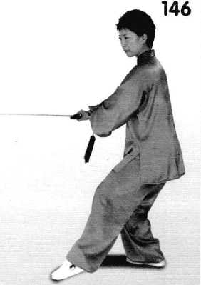 右脚横撤一步,重心移 右,左脚向右脚的左前方横扫 一小步,脚掌着地,成左虚 步,胸向西北,右手先向上略 走上弧逆缠翻腕再略走下弧, 持剑平刃向身体右前方带剑, 横向截击,力达剑前刃,剑把 在腹前,手心向下,剑尖向右 前方正西偏北,剑指在腹前附 于右腕,眼视剑尖。(图145、 146)