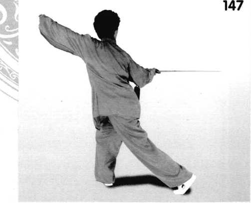 上体微右转至胸向西北, 双手双逆缠右上左下斜向在头 上云剑展开,剑尖斜向右上方 (东北),同时左脚走里弧向左 后撤步,然后重心移左,成左 弓步。胸再转向西南、东南, 右手顺缠翻腕手心向上向左云 剑至东南,再逆缠翻腕手心向 下,走下弧剑尖运至正南,剑 把在胸前,眼视剑尖。(图 147、 148、 149)
