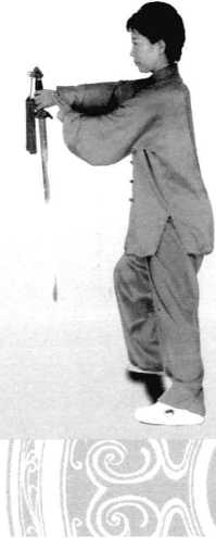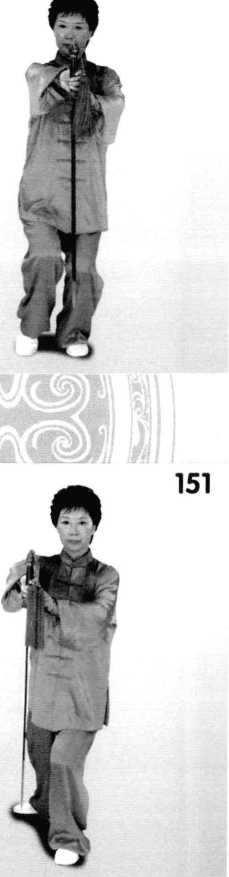 1 .右手持剑逆缠翻腕,使 剑身垂直向下,剑柄移腹前, 手心向外,剑尖向下,左手剑 指附于右腕,手心斜向下,右 脚先跟步移至左脚右侧,再后 撤一小步,胸转向西南。(图 150、 151)
