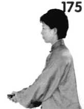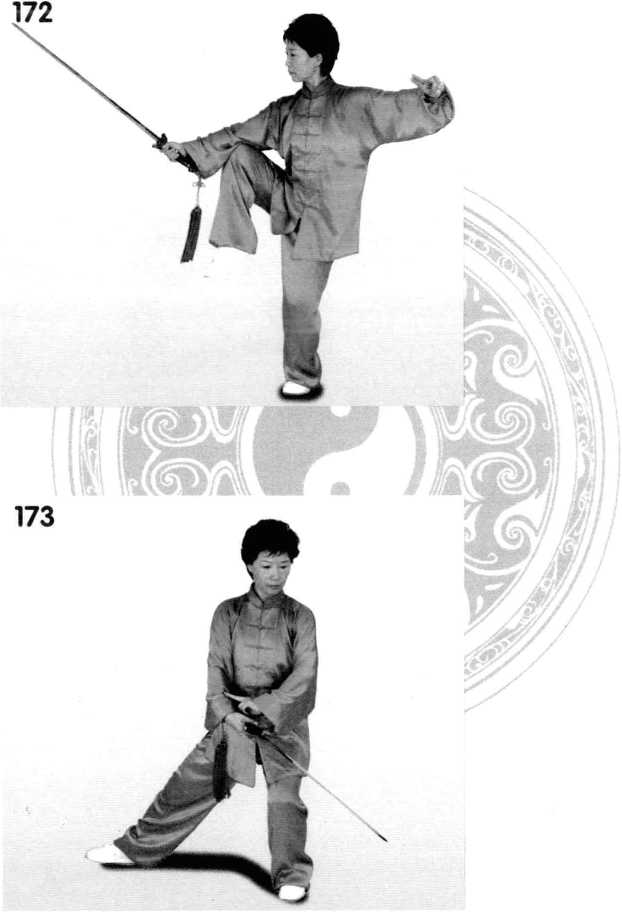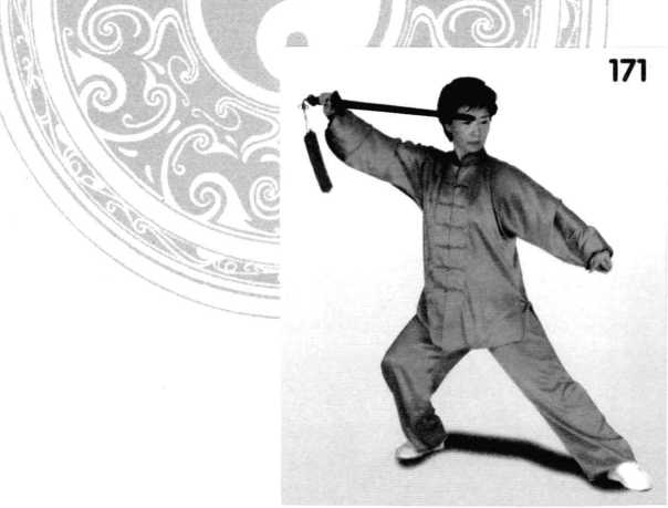 1 .重心移左,提右腿,向 右前上步,右手持剑左手剑指 先折腕双逆缠展开,再变双顺 缠,走一个合劲至腹前,剑指 合在右小臂上。(图171、 172、 173)