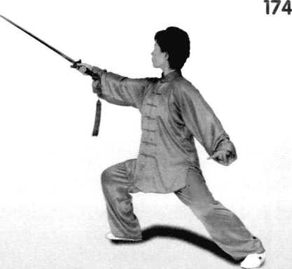 2 .胸向正西, 重心移右,成右弓 步,右手持剑经腹 前自下而上向右上 方走弧线削剑刺出, 剑把在身体右侧前 上方,手心斜向上, 剑尖斜向右前上方 (西北),剑指沉于 左胯外侧,手心向 下,剑指仍与剑尖 相呼应。开中寓合, 眼视剑尖。(图 174)