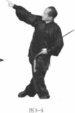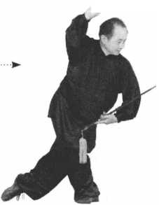 右手从4号位划到头 部上方(图3-6 );右手从4号位划到头 部上方(图3-6 );第七步对8号位上右脚,重心前 移成左插步,右手用手背领,从8 号位上方划下弧到4号位上方, 划弧时眼睛跟右手,向右拧腰,左 手抱剑如怀抱婴儿状,左肩和剑 尖都对8号位(图3-5);