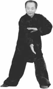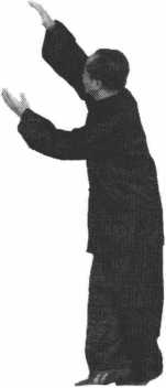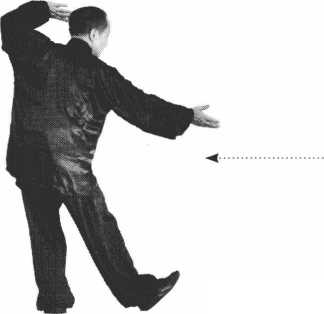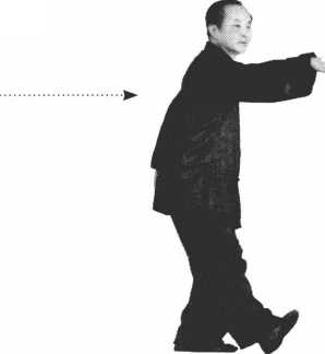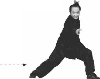 右手盘到右腰旁,两肘夹身,两手指 尖朝前,左脚落在左旁成左弓步,腰 左拧,两手一前一后伸出,右手前, 左手后,右手低,左手筒(图8-5 )
