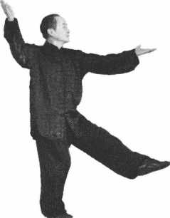 左手穿向7号位,右手划上弧 向右旁打开,左脚脚尖向7号 位点地后随即抬起,两手在身 体两旁平摊,重心在右脚,面 对正前方(图8—3);