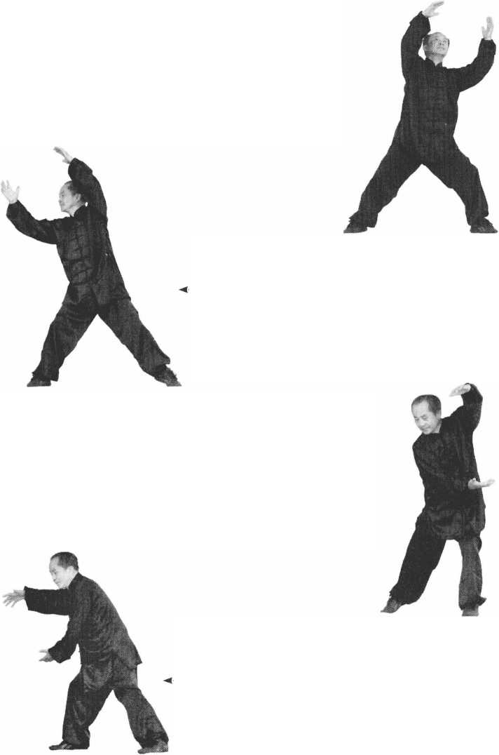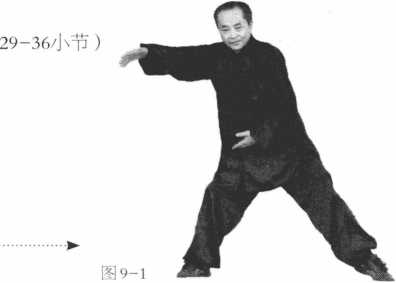 腰略向右拧,左手到身前 手心朝上,右手贴身抽回 盖在左手之上成抱球状, 两腿由弓步变马步,成侧 身抱球姿态(图9-1 );…