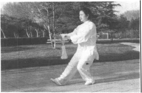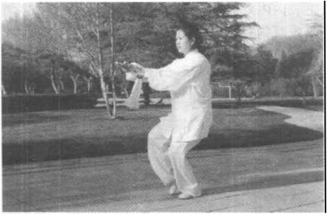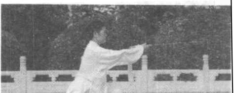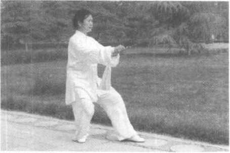(2) 本式要与下一式连动,即重心前移无明显停顿,左弓步 刚一到位右脚跟即离地并渐起。