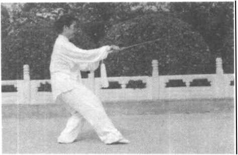 (2) 绞剑时剑尖要螺旋形前进,身体微偏左,头朝正前方, 迈步轻灵,身体保持平稳,整个动作均要以腰为轴带动全身,剑 随身进,身随剑行,浑然一体,劲力顺达,力贯剑身前部。