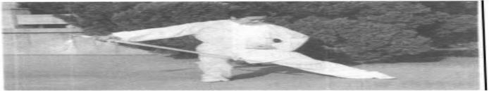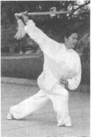 (3) 在上步和转体时身体要轻灵,步法要活,重心交替过程 中虚实要分明。整个势子要轻而不浮、螺旋绕环、舒展圆活, 身、剑、神浑然一体,气势饱满。