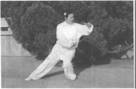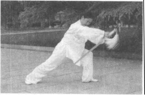 随剑向后下方穿剑,重心渐后移,上体微右转,左脚尖渐内 扣约135°;当剑尖穿至右小腿侧前方时,右臂外旋绕环,使剑 -158 ?