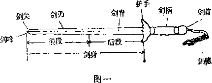 贯剑尖”等等。剑分剑尖、剑脊、剑身、剑首等部位(见图一 >。