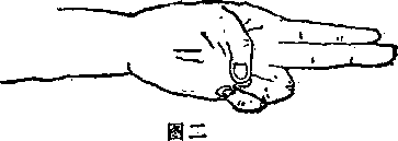 和中指伸直并拢,其余三指屈于手心,拇指压在无名指的指甲上(兕圈 二切忌将拇指和无名指分开。