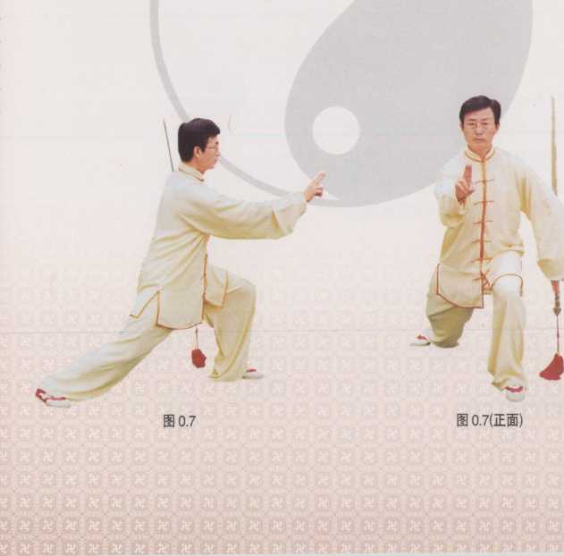 右手剑指向前伸出,掌心向前,掌指与眼平,左手持剑停于左髓 旁;眼视右手方向(图0.7)。