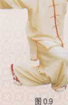 身体继续向右转,重心移至右 腿,左脚跟离地,膝部微屈,成半坐 盘式;左手持剑向前穿出,与肩平, 掌心转动向后;右手剑指向下经腹前 向右后上举,翻转掌心向上,腕与肩 平;眼视右手方向(图0.9)。