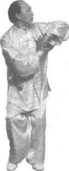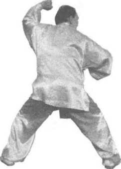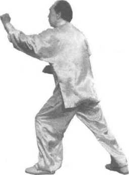 :左拳再次用力前击,拳面斜朝上,拳心朝下,臂微屈,高度 过肩;右拳收于左臂下方。眼视左拳(图50)。