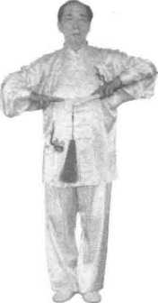 1. 左手反手持剑从身前向上,在胸前与右手会合,同时向上、至头顶上方 时再向两侧分开(图164),然后下落于小腹前。