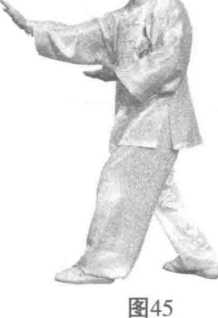 左合步穿掌:右手自前向右划弧至右胸前,即内旋向前方穿出,掌心朝 下,手指向前;左手外旋向前划弧,在右手向前穿掌时,收回于左腰侧,掌心 向上。同时,右脚跟上半步,身体重心后坐成左虚步(图45)。
