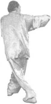 身体重心移于左腿上;右脚微 收,脚跟着地,身体右转90度。