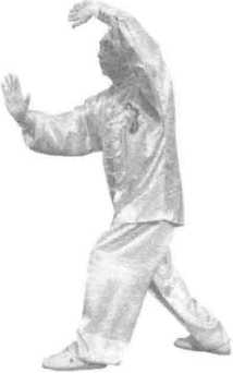 1. 叉步亮掌:身体重心后坐,左脚尖外撇,重心再移至左腿上,右脚向前 上步,扣脚尖落地,身体左转90度。同时,左手内旋,右手内旋移到左手腕 处,两手交叉成十字手向额前上方划弧,成抱球状。身体微起,眼视正前方 (图46、图47)。