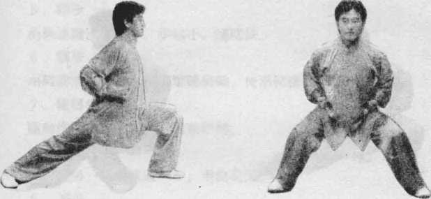 一腿向前跨出-大步,约为本人脚长的4~5倍,前脚尖微内扣,全 脚掌着地,屈膝半蹲,大腿接近水平,陈部与脚尖垂直;另一腿挺膝伸直, 脚尖内扣科向前方,全脚着地。上体正对前方,两拳收抱于腰间,双目向 前平■。左腿在前者为左弓步(图1 一17),右腿在前者为右弓步。