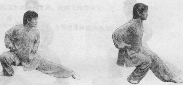 阐腿交义森权全蹲,前脚全脚着地,脚尖外展,后脚前掌着地,膝部 贴近前腿外侧,肾部坐于右腿接近脚跟处;两庐抱拳于腰侧;目向前平晛,