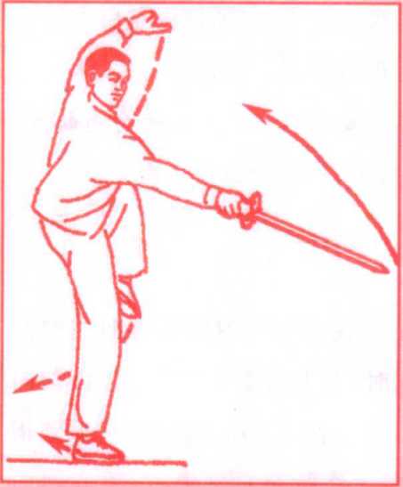 独立步;同时,右手剑向前上方刺出(手心向上),力注剑尖,剑尖 高与眼平;左手仍附在右手腕部;眼看剑尖。(图19)