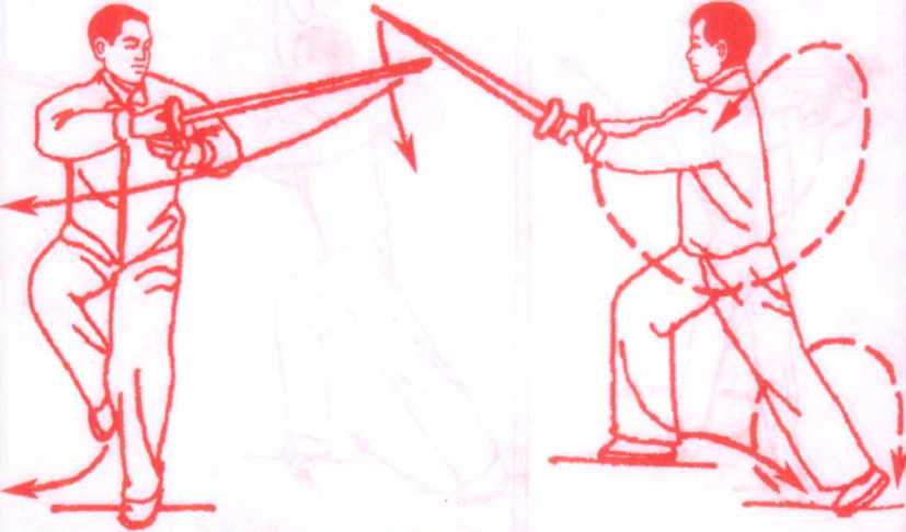 要点:右脚回撤与剑的同抽动作要一致。上体要正直。