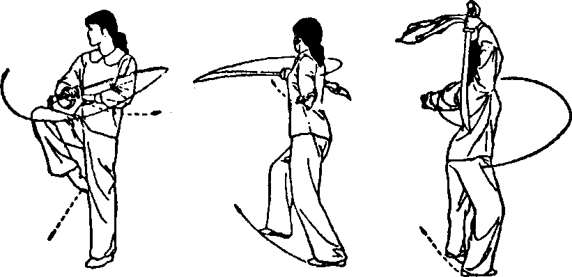 身体重心左移。左腿自然蹬直作支撑。右腿屈膝提起成 左独立式。同时右手持刀臂内旋,里收向下按刀,至胸腹之 间。手心向下,刀刃向外。刀背贴靠左小臂。左勾手变掌护