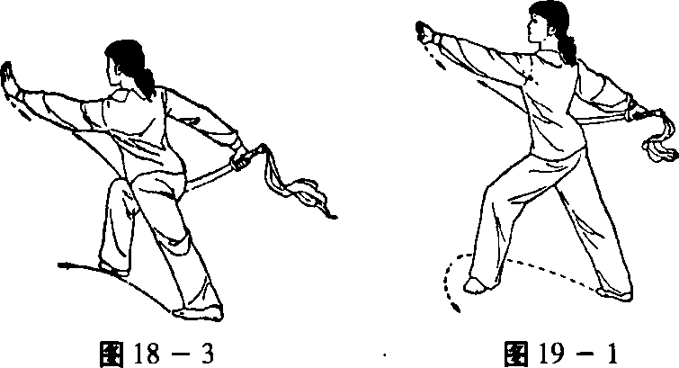 ①左腿下落体右侧前方。身体重心随之前移。同时右手 持刀向体右抡扭刀。刀刃向外。左掌自然伸向体侧开。眼随 刀走。(图18 — 1)