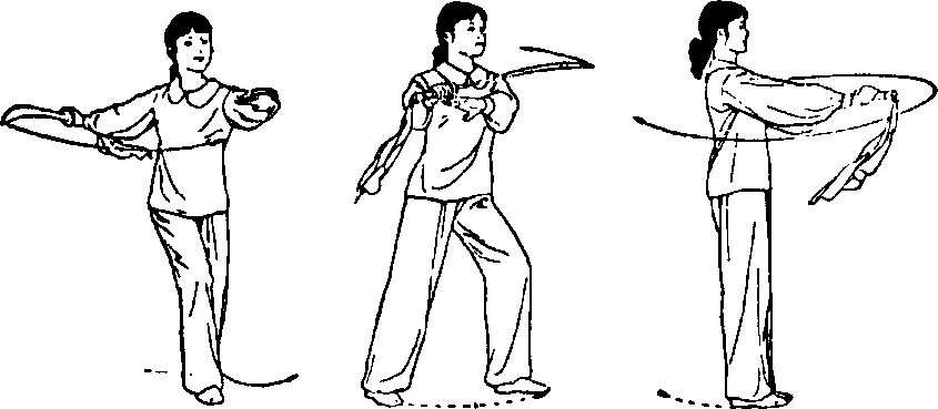 ①右腿后撤一步,上体随之右后转约90,同时右手持 刀向右后平斩。眼随刀走。(图20- 1)