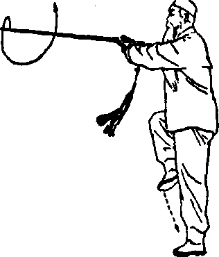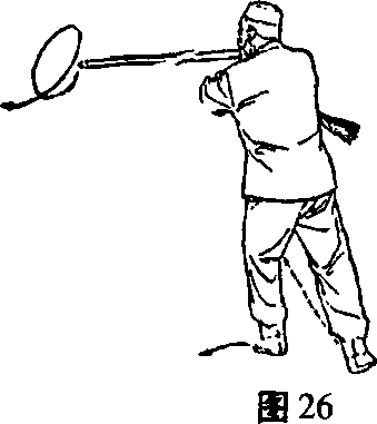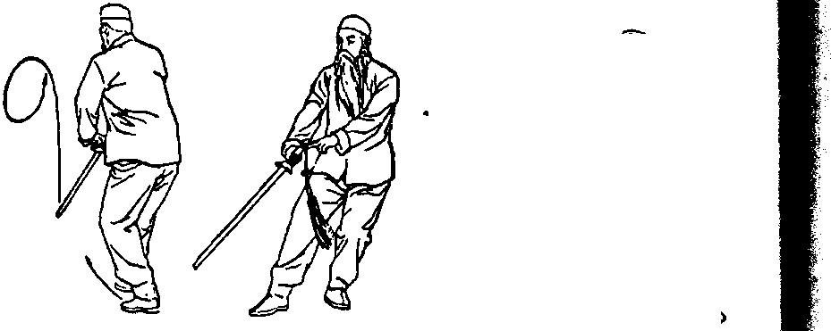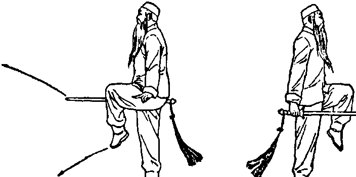 左脚尖里扣,身体右后转大于90° ,重心后移,左膝微 屈右脚向前进半步,脚掌着地,右膝微屈,右手握剑随体右 转,同时外翻,平剑身,手心向上,以腕力向体右后下方划 孤横崩扫,停于右膝外侧上方,剑身平刃,力达剑身中、前 端,剑身斜向下,左手剑指随按于右腕处,手心向下,目视 剑尖。(图25正反)