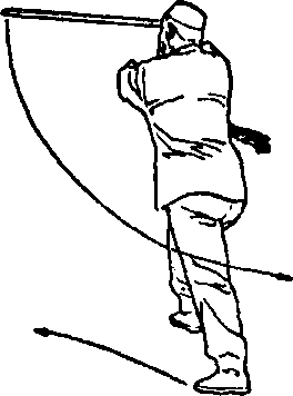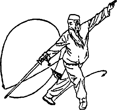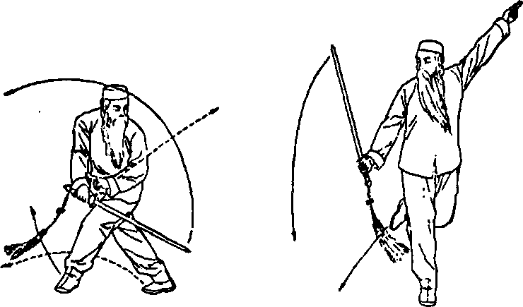 剑指向体左方经胸腹向上划弧停于体左后上方,经面前划弧 向体右侧劈剑,剑身立,剑尖向上,目视体右方。(图30)