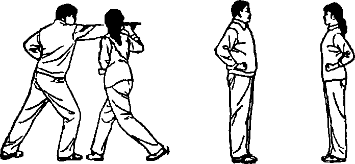预备势:甲(男)乙(女)相对立,立正抱肘。(图1)