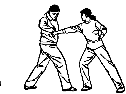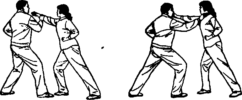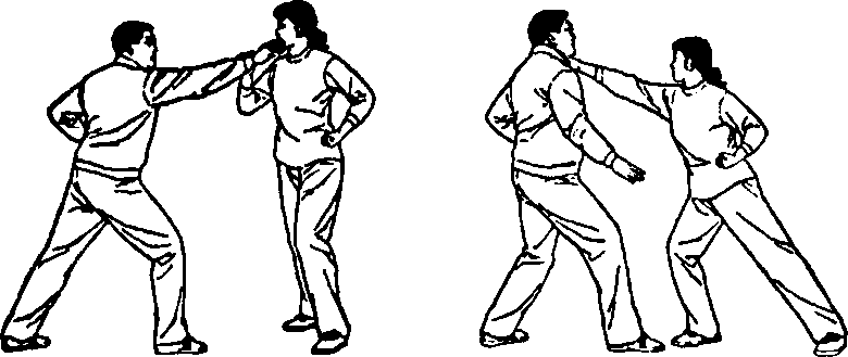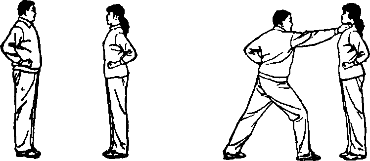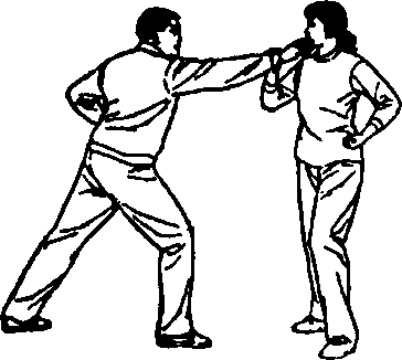 ①甲:虎口叉喉一右拳自腰际出变掌,虎口张开,向乙 之喉部叉掌,右脚同时前上一步,膝稍前弓,左腿自然伸直。 目视乙喉部。(图2)