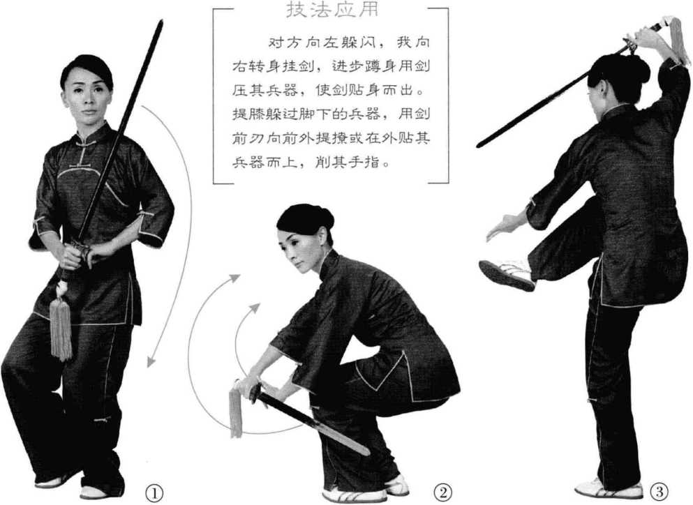 剑下落时,要先插入 对方兵器旁,再向前反刺 其裆。