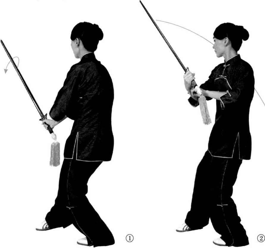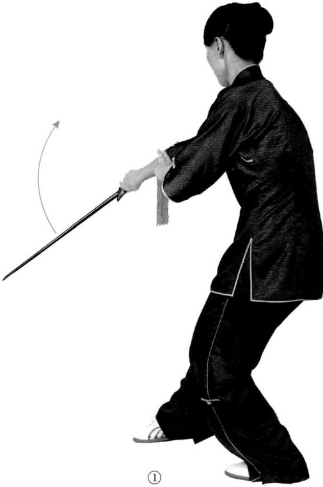 身向左转,收左脚 跟,弓左膝,重心移于左 腿。同时,右手剑柄上 提,用剑的下边刃上抹, 视线随之。剑诀向左打开 并置于腰腹前。(图1)