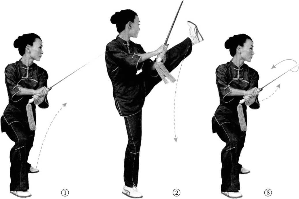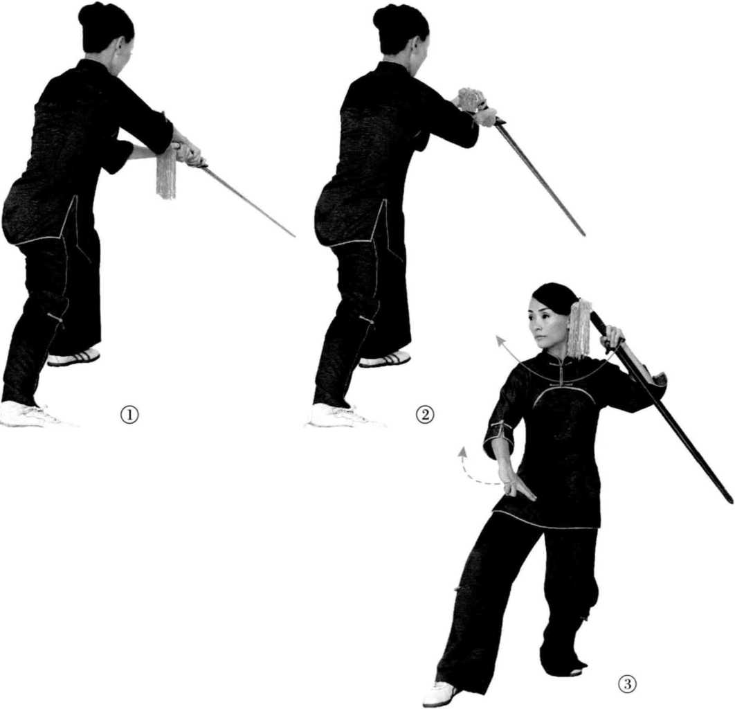 右手松开剑把,左手握剑把,向上高举剑 镖,上身长起,身体向右转。弓左膝,右脚向 右跨半步并虚落地。视线看向右前方。右手变 为剑诀,手心向下垂于右胯处。(图2、3)