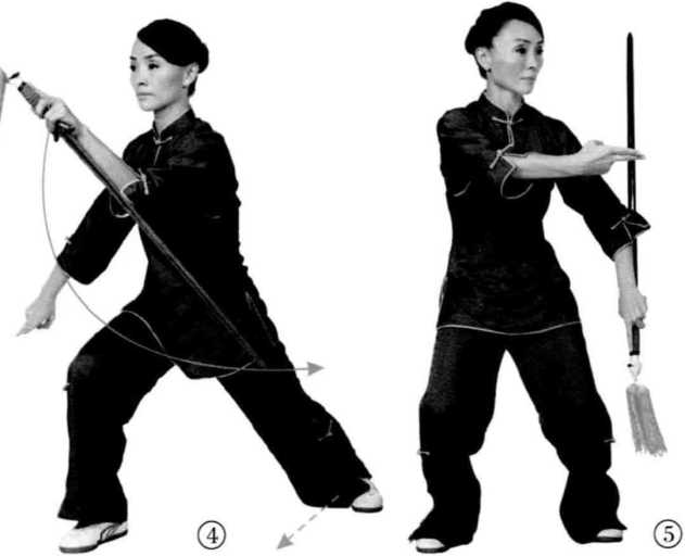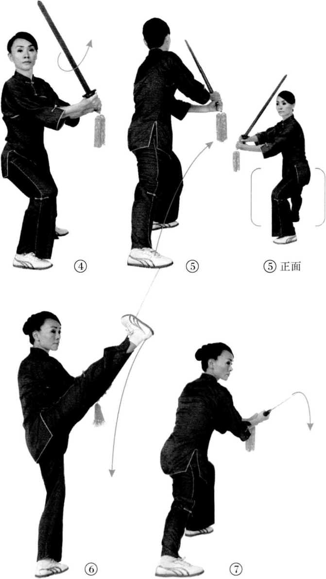 松左膝,重心后撤至左 腿。同时,双手翻转,剑身立 起,翻转过来。剑在腹前,配合 身体半面左转。视线随剑动。