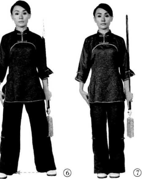 将重心转移至左腿,右脚 往上跨落在左脚左前方(图3、 6)o左脚再往左前上迈出,落 脚朝东。弓膝,重心前移至左腿 成左隅步弓势。在落脚、弓膝的 同时,腰微左转,以剑中刃外 抹,视线随剑动(图7)。