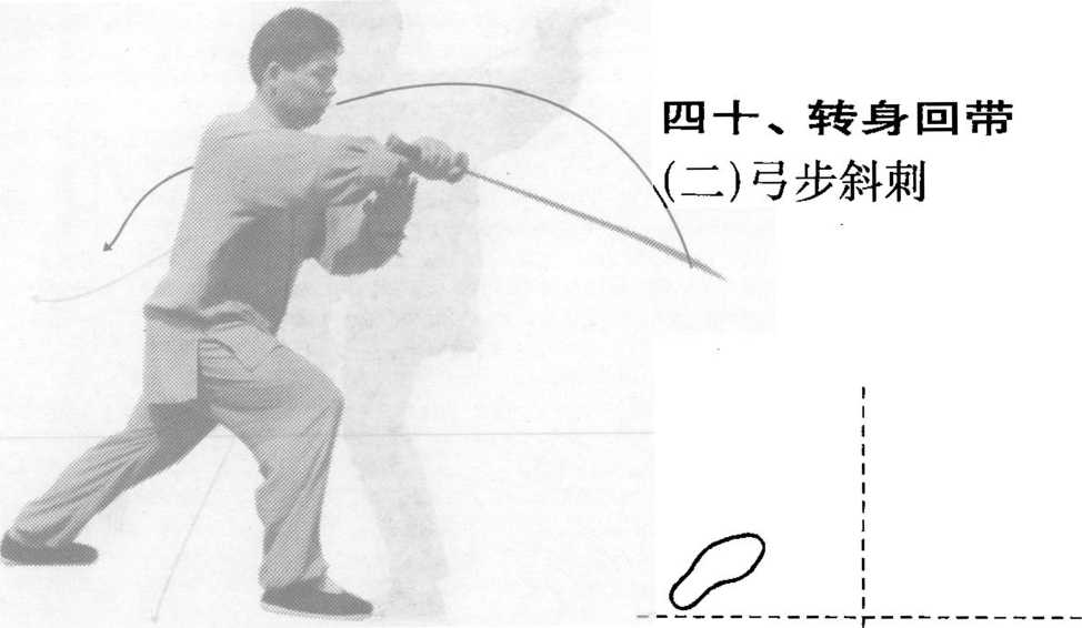 要点:转身、回带刀与左撑掌要协调一致。刀向后回带时 刀面要平,站立要稳,提膝要高过腰部O