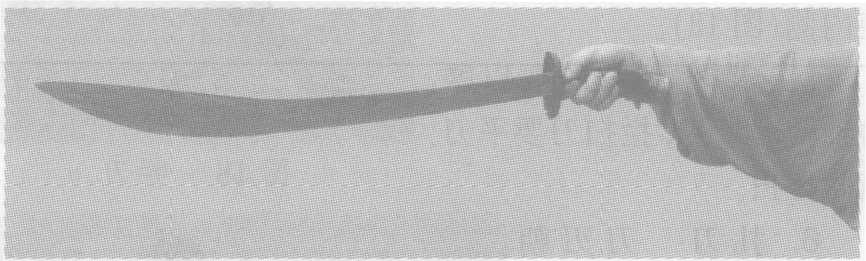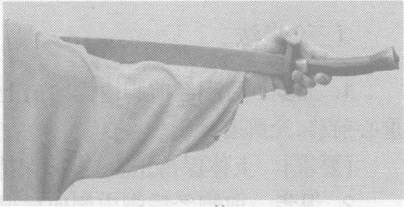 6. 扎刀刀刃朝 下、朝上或朝左,刀尖向 前直刺为扎,力达刀尖, 臂与刀成一条直线(图 19)0