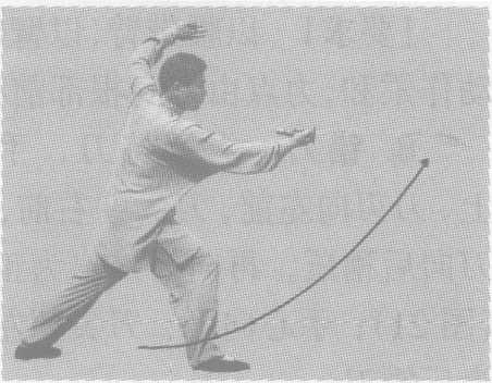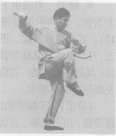6. 扣步 一腿支撑,另一腿提起,小腿内旋,向前、向里 上步,脚跟先着地,脚尖内扣,而后全脚着地。